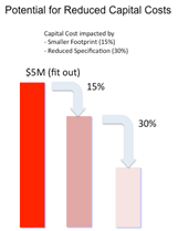 This figure shows reduced capital cost from a typical scale manufacturing facility design (15,000 sq. ft.), projected based on ‘CNC’ requirements compared to ‘C’ class requirements and a change in cost per sq. ft. of $100.